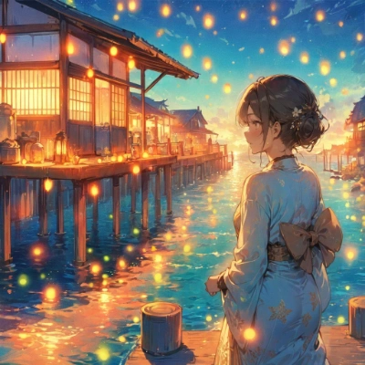 (((Masterpiece, High Quality, 8k, Best Quality, high resolution, line anime, 1 girl))),Colorful anime style,late Showa era,summer evening,seaside,girl,traditional attire,vibrant sea fireflies,magical,nostalgic,atmosphere,<lora:add-detail-xl:0.8>,<lora:crmu:0.6>,<lora:PE_AnimeBG:0.8>,<lora:Western_Comic_Style:0.3>,pattern,golden pattern,