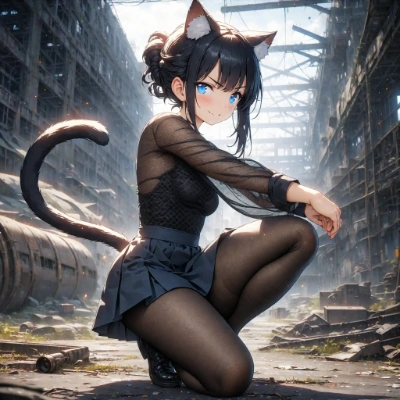 spy movie,cute theme,(masterpiece,high-resolution,extremely detailed CG,8k,4k,ultra-blur,detailed face),(abandoned factory),side view,1+girl,(cat ears),1+tail,black hair,updo,glowing blue eyes,delicated black mesh sleeve top,midi-skirt,black pantyhose,blush,hidding,standing on one knee,(serious,smile,plesured)