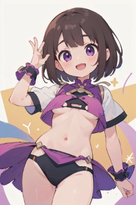 masterpiece, best quality, extremely detailed, anime, girl,<lora:flat2:0.55> <lora:hairdetailer:0> , bobcut, brown hair, purple eyes, (loli face:1.2),((medium breasts)),happy smile, thighs, ((underboob)),cleavage, {from behind|from below},