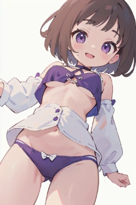masterpiece, best quality, extremely detailed, anime, girl,<lora:flat2:0.55> <lora:hairdetailer:0> , bobcut, brown hair, purple eyes, (loli face:1.2),((medium breasts)),happy smile, thighs, ((underboob)),cleavage, {from behind|from below},,