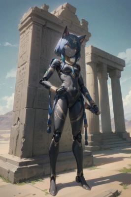 masterpiece, best quality, extremely detailed, anime, full body shot, a humanoid robot, black goddess statue, black robot, cat head, black metal skin, Bastet, mobile weapon, clenched teeth, holding a golden ankh, rocky desert, blue sky, ancient egyptian temple, ancient egypt,