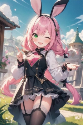 masterpiece, best quality, extremely detailed, anime <lora:flat2:-0.3> <lora:hairdetailer:0> , girl, twintail, garter belt, red hair, green eyes, chibi character, fantasy, watercolor, rabbit, wink, clear sky, smile, pointing,