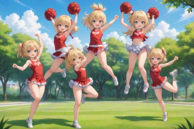 anime style small girl, blonde short hair with blue eyes and wearing a red ribbon, (hair bow:1.3)along with three friends, all dressed in cheerleader outfits, practicing cheerleading routines in a park, energetic and synchronized movements, the park filled with greenery and open space, perfect for practice, the girls showing determination and teamwork, pom-poms in hand, executing jumps and cheers, expressions of focus and joy on their faces, casual onlookers in the background, admiring their spirit and coordination, (hair color:blonde)(eye color:blue)(accessory:red ribbon)(clothing:cheerleader outfits)(activity:practicing cheerleading in the park)(mood:energetic and focused)(setting:park with greenery)(props:pom-poms)(interaction:teamwork and determination)