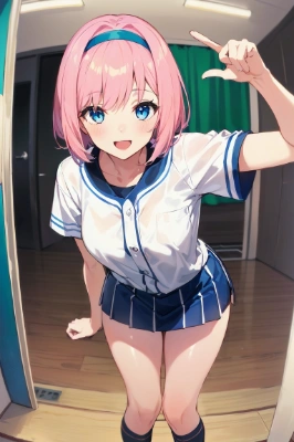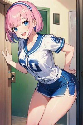 (masterpiece, best quality:1.2), (absurdres, absolutely resolution, ultra high res, 8k, perfect anatomy, extremely detailed),BREAK(1girl, cute girl, shiny body, shiny skin, middle breasts), (pink hair, short bob hair, hairband, blue eyes), (beautiful anime eyes with luster reflection),BREAK(baseball uniform, miniskirt), smile, open mouth,BREAKdoor, doorway, indoors, leaning forward, opening door,
