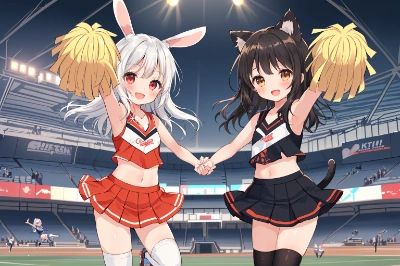 ゆめかわツインテちゃん、ラムネボブちゃん、女幹部さん、ポニテちゃんのちびキャラでのチアコスセットです♪ ツインテちゃんのリボンもポンポンになる面白くてオイシイ装備に癒やされました💕 ツインテール+チアリーダー=カイリキー(ポンポン×4) という新しい公式が見つかりましたw ツインテちゃんがネタ装備オンリーだったので最後にまともなチアコスもしてもらってますw