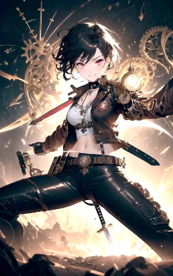 (steampunk style:1.3),(masterpiece),best quality,(perfect anatomy,perfect image,high quality image,high resolution),extremely detailed CG,fine line drawing,beautiful detailed glow,Light particles,HDR,ultra-detailed,(A girl,black short hair,red eyes,tank top,white jacket,black choker,cool smile,cross,holy symbols,leather pants,Clothes decorated with gears and small pocket watches,fighting stance,holding a gothic scythe,long scythe),((realistic,hyper realistic character,high detail))