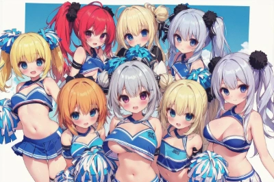 (masterpiece), (best quality),(ultra-detailed),(illustration),(extremely detailed),(perfect anatomy),(super detailed skin),(detailed),(beautiful detailed eyes),8girls,multiple girls,cheerleader,two side up,ponytail,longhair,single hair bun,, shorthair, blonde hair, silver hair, red hair, blue hair,smile,pom pom (cheerleading),stadium,,,