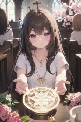 masterpiece, best quality, extremely detailed, anime, girl, long black hair, parted bangs, Long dark blond hair, big top sleeves, Red Gem Necklace, Lycoris radiata, translucent fluttering dress with lace, frilled sleeves, translucent pink skirt, dissolving dress, hands hide in puffy sleeves, garter straps, white silk Clothes, halo, night, on beautiful detailed water, Flying flames,,