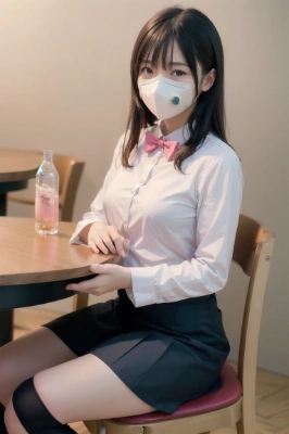 (photorealistic:1.4), (RAW photo), masterpiece, best quality, extremely detailed, girl, white blouse, pink mask, navy blazer, pleated mini skirt, high socks, black long hair, neat and clean, shy look, sitting, table, chair,