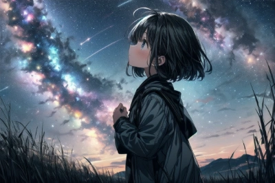 masterpiece, best quality, extremely detailed, anime, girl, 18yo, solo, bob cut, black hair, eyes closed, looking up the sky, milky way, starry sky, standing on the left side of the screen, side view, far view, night, grass field, praying, nostalgic, sadness, darkness, less color, sketch, far view,