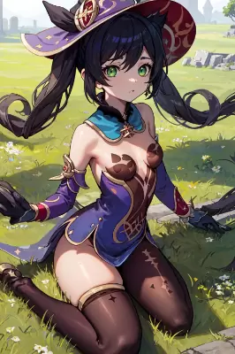 best quality,ultra-detailed, extremely detailed CG,beautiful,(genshin),(mona),(genshin impact),black hair,green eyes,(light twin tail:1.5),black tights,small breasts,short girl,blue clothes,witch hat,straight bangs, game_cg, thick thighs, breast squeeze, flat chest, girl,woman,female, young,18 years old, long hair, ponytail, sidelocks, saint beautiful detailed faces, human hands, small breasts, green eyes, with chat, black gloves,cleavage, blue Clothes, beautiful detailed garden, ruins, delicate grassland, Absurd,dynamic background, detailed background,wariza,amazing quality, Aspect ratio 1400×1000,150 million pixels, ultra high image quality