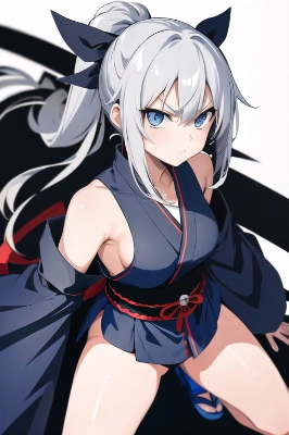 1girl, solo, breasts, looking at viewer, blush, smile, bangs, cleavage, bare shoulders, medium breasts, underwear, green eyes, collarbone, white hair, indoors, side ponytail, see-through, bare arms, bed, on bed, scrunchie, lingerie, negligee