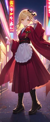 1girl, A kawaii lustful vampire girl with low twintail with drill hair and swept bangs and one sidelock and yellow eyes and large breasts and baby face and droppy eyes is standing in the theater. a hand on head and a hand on hip and v, looking at viewer, smile, (pink hair streaks:1.0), (blonde hair:1.1), (bat hair ornaments, hairclip, gothic fashion, black lace headband, ruby diamond drop earring, black lace choker, black party dress with black and dark red high waist petticoat skirt, scoop neckline, puff and long sleeve, frilled cuffs, black half palm gloves, black sash belt with gold key charm, white tights, black back bow strappy heels), (energetic compositions, abstract particles, chromatic_aberration, abstract background:0.9), (depth of field, full body shot, dutch angle, from side:0.9), close to viewer, (illustration, colorful lighting:1.1), Masterpiece, top quality, very detailed,