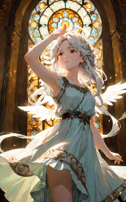 a 20-year-old Neutral actress. long black hair inner red, Alphonse Mucha's painting style, jumping smile, clear face,