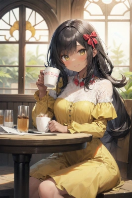 masterpiece, best quality, extremely detailed, anime, full body shot, a girl, high teen, princess, young lady, beautiful girl, smile, happy, long hair, blonde hair, spiral curl hair, putting blue ribbon on her hair, green eyes, tareme, droopy eyes, classic princess dress, long skirt, light blue colored dress, ruffle dress, holding a cup with cocoa, sitting in a chair, colonial style cafe, medieval cafe, medieval table, colonial style window, medieval window, indoor, caribbean, tropical, middle age, Age of Discovery <lora:hairdetailer:0> <lora:eyecolle_dianthus_v100:1> ,