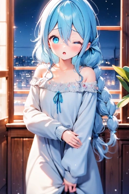 masterpiece, best quality, extremely detailed, (illustration, official art:1.1), shy,1 girl ,(((( light blue long hair)))), light blue hair, ,10 years old, long hair ((blush)) , small breasts,cute face, big eyes, masterpiece, best quality,(((((a very delicate and beautiful girl))))),Amazing,beautiful detailed eyes,blunt bangs((((little delicate girl)))),tareme(true beautiful:1.2), {{{official art}}}, best quality, absurdres, {{{{{{{{{{wavy hair, applying makeup}}}}}}}}}}, nightgown, {{{lace trim}}}, off shoulder, braided bangs, {{{blush}}}, very long hair, tareme, long eyelashes, {{half-closed eyes}}, {{{{close-up, portrait}}}}, {{{sidelocks}}}, {{{{winter clothes, open cardigan, :o}}}}, low twintails, sleeves past wrists, oversized, {{waist ribbon, waist bow}}, {loli, child},{{{{{lips, head tilt, sidelighting, sunbeam, overexposure, shiny, glowing, light particles, hand up, solo, lipstick tube, hand to own mouth}}}}}, hair between eyes, leaning to the side, solo focus, indoors, from side, lipgloss, stud earrings, looking at viewer<lora:make25d_type2_v100:1> <lora:eyecolle_isotoma_v100:1> ,,