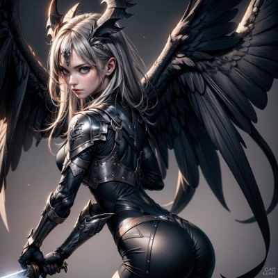 Ultra high definition image, photo image, ancient beautiful female Valkyrie, gray background, devil's horns, devil's wings, close up, Backlit, holding a sword, by guraAIart<lora:EMS-179-EMS:0.800000>