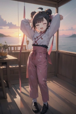 masterpiece, best quality, extremely detailed, anime, full body shot, a girl, lolita, child, black hair, short hair, 2bun hair, bedhead, ahoge, black eyes, narrow eyes, (left eye closed wink), (wink), (left eye closed), yawning, sleepy, bedhead, kung fu, (completely pink kung fu clothes), (completely pink kung fu pants), black loafers shoes, arms up, hold hands, standing on the wooden ship rim, caribbean, sea, medieval sailing ship, galleon ship, morning sky, sunrise, midde ages, Age of Discovery morning sunshine, middle age, Age of Discovery,