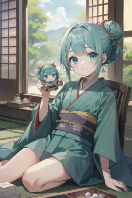 wink, masterpiece, best quality, highres, 1otoko no ko, yellow cardigan, (brown pleated skirt), apron, かわいい, flat chest, aqua hair, aqua eyes, half updo, smile, cooking, kitchen<lora:flat2:0> <lora:hairdetailer:0.5>,