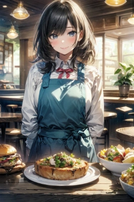 masterpiece, best quality, extremely detailed,(high quality),(high detailed),woman,(table),(food),clerk,apron,(setting picture:1.6),inside restaurant,(food),(dinner),arms behind back,smile, <lora:hairdetailer:0.8> <lora:eyecolle_salvia_v100:1> ,,,,,,,,,