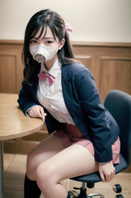 (photorealistic:1.4), (RAW photo), masterpiece, best quality, extremely detailed, girl, neat and clean, white blouse, (pink gas mask:1.2), (navy blazer:1.1), navy pleated skirt, navy high socks, wide red ribbon bow tie, black long hair, embarrassed, shy look, sitting, table, chair,,