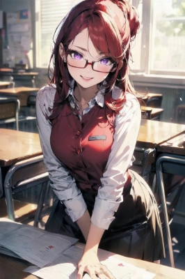 (masterpiece), (best quality),(ultra-detailed),(illustration),(extremely detailed),(perfect anatomy),(super detailed skin),(detailed),(beautiful detailed eyes),1girl,solo,red hair,long hair,hair up,sidelocks,purple eyes,glasses,red lips,white shirt,red vest,black skirt,collared shirt,leaning back,desk,teacher,smile,,