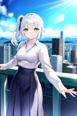 1girl, solo, long hair, breasts, looking at viewer, bangs, large breasts, red eyes, gloves, holding, medium breasts, closed mouth, weapon, braid, ahoge, white hair, cowboy shot, outdoors, sky, black gloves, sword, holding weapon, bodysuit, covered navel, night, halo, holding sword, night sky, skin tight, dual wielding, black bodysuit
