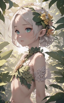 (masterpiece),perfect anatomy,best quality,intricate,(elf),cinematic lighting,shading,super detailed skin,(illustration),ultra-detailed,(extremely delicate eyes:1.2),(child,loli,girl face,round face,petite,slender,infant body type,(crop-top),tight fabric in vibrant green),(extremely detailed crop-top),(leaf pattern embroidery:1.2),((lrealistic,hyper realistic character,high detail)),(fantastical atmosphere,sisurrounded by various flowers),vibrant colour,light and shadow