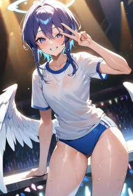 woman, plain and charming, white T-shirt, buruma, shiny thighs, angel halo, white big wing, black hair, glasses, sweaty, stage, dance, smile, shy,