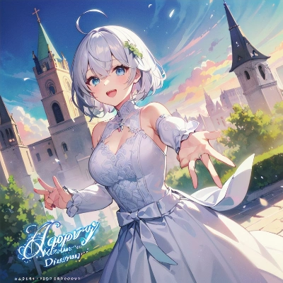masterpiece, best quality, extremely detailed, anime, girl, skirt, girl, longhair, braids, wedding dress, blonde hair, silver hair, wink, blue eyes, red eyes, ojou-sama, watercolor, foreshortening, colorful, day, blue sky, church, clear sky, smile, anniversary, holding hands, standing, sisters, two people, older sister, younger sister,