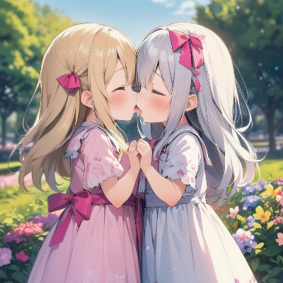 masterpiece best quality extremely detailed anime 2girls yuri ((((little female child)))) ((loli)) ((toddler)) ((preschooler)) ((long)) blonde hair flower (long) silver hair flower pink gown pink luxury (long) dress light blue gown decorations frilled lace-trimmed embroidery long sleeves outdoors floral garden ((blush)) embarrassed (looking away) (looking at each other) 2girls yuri beautiful landscape wide shot cheek-to-cheek face-to-face [blue eyes],
