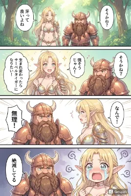 ある日、エルフの村に突如としてペンギンの大群が襲来した。しかも、これらのペンギンは人食いペンギンで、村人たちは大パニックに陥った。 「何でこんなところにペンギンが!?」と、エルフの戦士リリアは驚きの声を上げた。 「それにしても、人食いペンギンって何だよ!?」と、彼女の友人であるセリアが叫んだ。 「冗談、顔だけにしろよ。」と、リリアが突っ込むと、村の賢者エルドラドが深刻な表情で言った。「このペンギンたち、本当に人食いだ。」 リリアたちはペンギンたちに立ち向かうことにした。しかし、ペンギンたちは予想以上に強く、なかなか手強かった。それでも、リリアたちは一歩も引かず、果敢に戦いを挑んだ。 「リリア、あのペンギン、目が光ってるよ!」セリアが叫んだ。リリアは見ると、確かにそのペンギンの目は真紅に輝いていた。 「それがリーダーか!」と、リリアは剣を振り上げ、そのペンギンに向かって突進した。激しい戦闘の末、ついにリリアはリーダーのペンギンを倒し、残りのペンギンたちは逃げ出した。 「よし、これで村は安全だ!」と、リリアが胸を張った。セリアは彼女を見て、「リリア、すごいよ!」と感動的な表情で言った。 その後、村は平和を取り戻し、リリアたちは英雄として村人たちから祝福された。 夕暮れ時、リリアとセリアは村の外れに立って、遠くに消えていくペンギンたちを見送った。その背後には、美しい夕日が広がっていた。そして、村は静かに時を刻み、月明かりが穏やかに村を照らしていた。