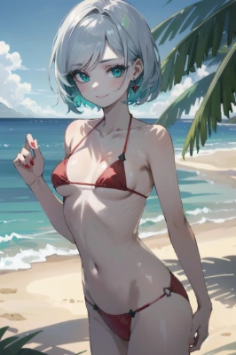 pixivの「滝川ジンのギャルシリーズ」の白ギャルの沙理亜ちゃん。 オレっ娘だけど水着は意外と可愛いフリルビキニ。 競泳水着で気合い入りまくりの更紗や、天然マイクロビキニの衣留夢ちゃんにツッコミを入れるのに忙しい。 沙理亜ちゃんたちの青春ストーリーはpixivの「滝川ジンのギャルシリーズ」でどうぞ!