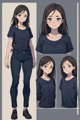 Please create a full-body illustration of an elderly female magician standing upright. Additionally, please provide three separate facial expressions : a confident smiling face, a surprised expression, and a sad face. The character is dressed in a brown robe and a long skirt. Ensure that the background is transparent. The character has black hair and brown eyes. middium brests. Please avoid any overlapping and strive for a masterpiece with the best quality.,,