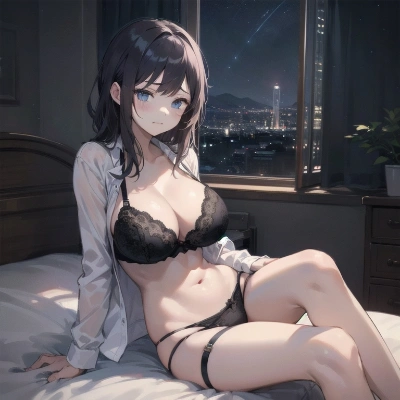 masterpiece, best quality, 1girl,29 years old,glamor,big breasts,big hip,white blouse,open shirt,sexy bra,sexy panty,no shouse,sad face,sitting on bed,girl@!@s stylish room,night,,