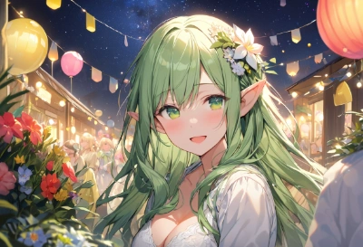 Penguin,fantasy,lots of flowers,starry sky, milkyway,northen lights,party decorations, midnight,(light green hair),[yellow hair],The ends of the hair are yellow tip,elf ,face to face,white dress,flower hair ornament,short ear,The ends of the hair are spread out softly,solo,1 woman,slender,best quality, (((extremely masterpiece))),best quality, extremely detailed,a pretty woman, longhair,green eyes,elf, beautiful small breasts,cleavage,ribbon,great joy,:d,smile upper body,looking at viewer, <lora:hairdetailer:1> <lora:asb-CH1:0.2> <lora:sensualface_type2:0.6> ,,,,
