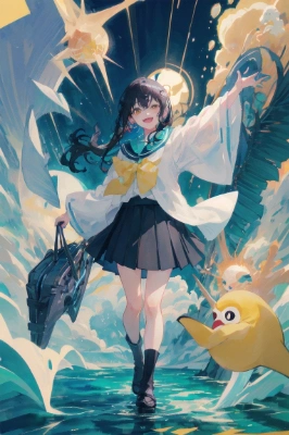 masterpiece, best quality, extremely detailed, anime, Penguin, longhair, pinafore dress, black hair, black eyes, personification, sisters, braids, longhair, maid uniform, white hair, black eyes, sisters, two people, personification, watercolor, fantasy, colorful, foreshortening, wing, sea, smile, cuddling, happy, lying down,