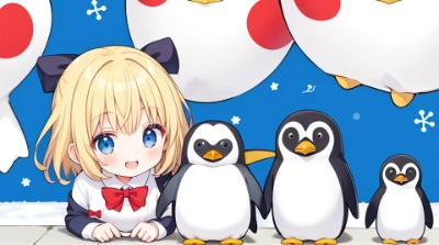anime style girl, loli,short blonde hair, blue eyes, red ribbon in hair, (hair bow:1.3),red bow,hugging large penguin plushie, cute expression, visible happiness, soft lighting, indoor setting, pastel colors, fluffy texture of plush, small room, surrounded by other plushies, wooden floor, light streaming through window, gentle shadow, (age:0.7), (hair color:1.0), (hair length:0.8), (accessory: red ribbon:1.2), (eye color:1.0), (expression:0.9), (background detail: room:1.0), (pose: hugging plushie:1.3), (light:0.8), (fluffiness:1.1), (background: indoor:1.0), (color scheme: pastel:1.0)