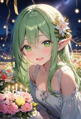 Birthday party,fantasy,lots of flowers,starry sky, milkyway,colorful flowers,party decorations, midnight,(light green hair),[yellow hair],The ends of the hair are yellow tip,elf ,face to face,white dress,flower hair ornament,short ear,The ends of the hair are spread out softly,solo,1 woman,slender,best quality, (((extremely masterpiece))),best quality, extremely detailed,a pretty woman, longhair,green eyes,elf, beautiful breasts,cleavage,ribbon,great joy,:d,smile upper body,looking at viewer, <lora:hairdetailer:1> <lora:asb-CH1:0.2> <lora:sensualface_type2:0.6> ,,,