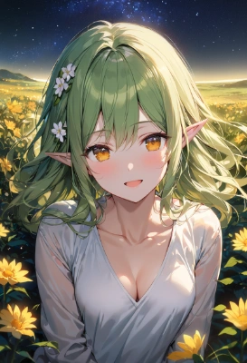 Birthday party,fantasy,lots of flowers,starry sky, milkyway,colorful flowers,party decorations, midnight,(light green hair),[yellow hair],The ends of the hair are yellow tip,elf ,face to face,white dress,flower hair ornament,short ear,The ends of the hair are spread out softly,solo,1 woman,slender,best quality, (((extremely masterpiece))),best quality, extremely detailed,a pretty woman, longhair,green eyes,elf, beautiful small breasts,cleavage,ribbon,great joy,:d,smile upper body,looking at viewer, <lora:hairdetailer:1> <lora:asb-CH1:0.2> <lora:sensualface_type2:0.6> ,,,