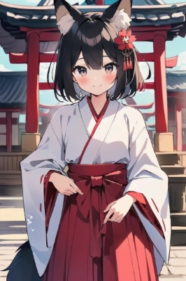 anely detailed,a girl,illustration,(black eye,fox girl,black hair,ultra Super long hair,somewhat drooping eyes,childish face,(Smaller than average height)),(shrine maiden outfit,red hakama (e.g. worn by miko, or noblewomen at court)), flower hair ornament,smile <lora:flat2:0> <lora:hairdetailer:0> ,Emphasis from the chest up,
