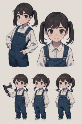 Please create a full-body illustration of a standing female child. Additionally, provide three separate facial expressions: a confident smiling face, a surprised expression, and a sad face. The character is dressed in student uniform. Ensure that the background is transparent. Avoid any overlapping and aim for a masterpiece with the highest quality.,,,,