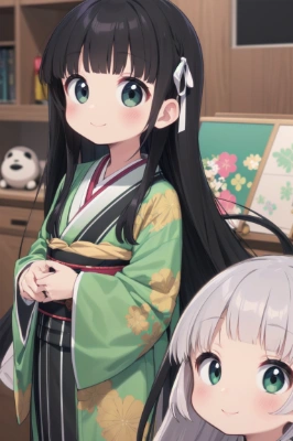 1 girl,(((very longest hair))),black hair, smile,straight Hair,hair ribbon,mintgreen stripe,Black Eyes,flat chest,straight Across bangs,princess Cut, Very Long Sideburn,roundry Head,Droping eyes,cute,Meekness,Bob Cut,long back hair,12 years Old, kimono, Droopy Eyes,