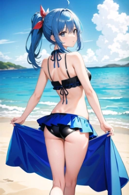 1girl, solo, long hair, breasts, looking at viewer, bangs, blue eyes, ribbon, holding, blue hair, standing, swimsuit, hair ribbon, ponytail, ahoge, bikini, outdoors, frills, parted lips, sky, day, looking back, cloud, from behind, blue sky, black bikini, ocean, halterneck, back, beach, towel, frilled bikini, kneepits, sarong, bikini skirt