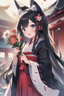anely detailed,a girl,illustration,(black eye,fox girl,black hair,ultra Super long hair,somewhat drooping eyes,childish face,(Smaller than average height)),(shrine maiden outfit,red hakama (e.g. worn by miko, or noblewomen at court)), flower hair ornament,smile <lora:flat2:0> <lora:hairdetailer:0> ,portrait,tatami room,sit,