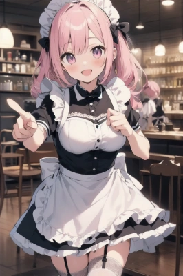 masterpiece, best quality, extremely detailed, anime, girl, miniskirt, Droopy Eyes, girl, longhair, maid uniform, garter belt, short sleeve, pink hair, odd eyes, maid, colorful, fantasy, magic, cafe, different world, smile, panty shot, smiling, happy,greatbust,