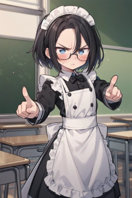 masterpiece, best quality, extremely detailed, anime, forehead, boy, a cool boy, good-looking guy, handsome man, shorthair, black hair, student, classroom, cool, glasses <lora:hairdetailer:1> <lora:eyecolle_aster_v100:1> ,maid uniform, blushing, angry, embarrassment, standing, Pointing,