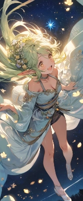 fantasy,starry sky, milkyway,lots of flowers,[crystal flowers], midnight,(gradation light yellow green hair),[yellow hair],Chignon hairstyle,The ends of the hair are yellow tip,(petals:1.3),wind,elf ,face to face,national costume,flower hair ornament,short ear,The ends of the hair are spread out softly,solo,1 woman,slender,best quality, (((extremely masterpiece))),best quality, extremely detailed,a pretty woman, shoulder length hair,amber eyes,Drooping eyes,elf, beautiful small breasts,cleavage,great joy,:d,smile,full body,looking up,from above, <lora:hairdetailer:1> <lora:asb-CH1:0.2> <lora:darkness_v100:1> <lora:sensualface_type2:0.75> ,gorgeous legs,,,,,,,
