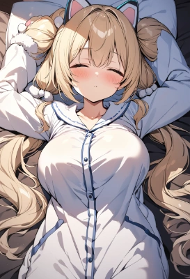 masterpiece, best quality, absurdres, ultra detailed, 8K, super fine illustration, highly detailed beautiful face and eyes, perfect anatomy, professional lighting,BREAK(1girl, cute girl, shiny body, shiny skin, large breasts), (blonde hair, long twin tails, glowing blue eyes, tsurime),BREAK(wearing fluffy cat kigurumi pajama, sleepy, sleeping on the bed), bedroom, morning, cowboy shot,