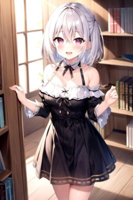 1girl, solo, breasts, blush, smile, open mouth, bangs, red eyes, ribbon, bare shoulders, twintails, standing, swimsuit, hair ribbon, white hair, :d, cowboy shot, small breasts, outdoors, frills, sky, choker, day, cloud, pink eyes, water, from behind, blue sky, one-piece swimsuit, black ribbon, ocean, black choker, beach, casual one-piece swimsuit, frilled swimsuit, pink one-piece swimsuit
